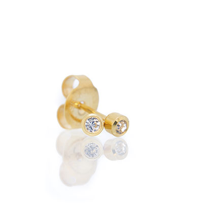 Arete exclusivos e importados, de acero quirúrgico grado 316 medicado, hipo alergénico, esterilizados, de uso permanente en baño de oro de 24 k, un año de garantía, el palito del arete ultra delgado permite deslizarse suavemente en el lóbulo facilitando la perforación.
